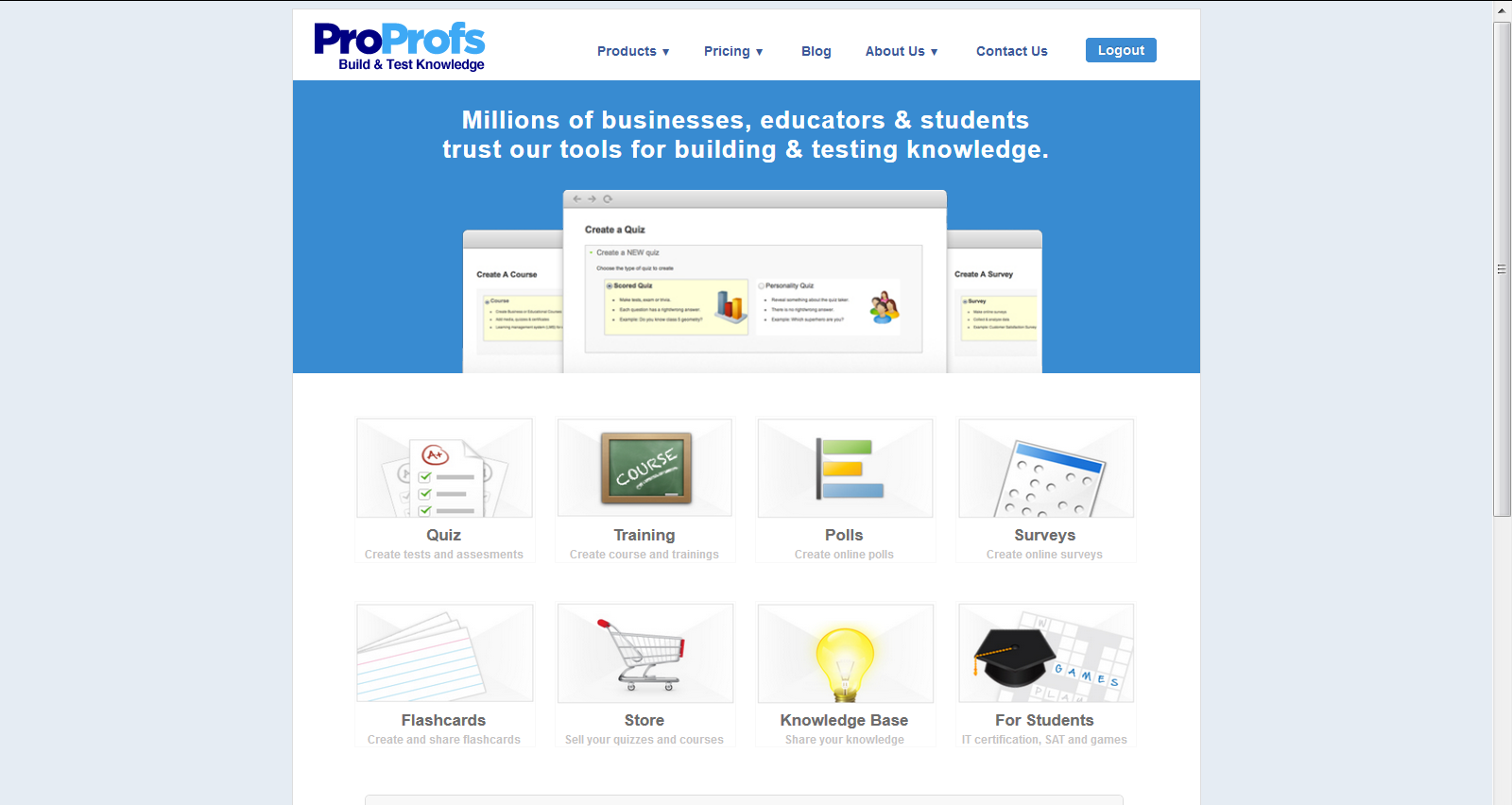 ProProfs paid products allow creating quizzes & online courses for education & business purposes. ProProfs is the leading provider of software as a service (SAAS) tools for building and testing knowledge. Through its tools such as Quiz, Survey, Knowledge base and Training products, ProProfs offers trainers, marketers and educators powerfully-simple features without requiring users to download or learn expensive software. With the.